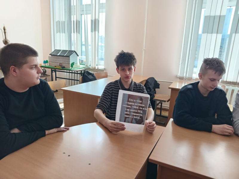 18.04.2025 года в рамках межведомственной акции «Счастливая семья – счастливое детство!» с учащимися группы П-11 состоялся диалог «Как справиться с трудной жизненной ситуацией?», организованный педагогом социальным Кругляк Г.В., с участием Кравцова А.А., заведующего отделения комплексной поддержки в кризисной ситуации Центра социального обслуживания населения Центрального района г. Гомеля.
