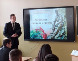 Со вступительным словом выступил Шаньков А.А. Учащимся был продемонстрирован видеофильм о хронологии военных действий в Афганистане с декабря 1979 по февраль 1989. Участники встречи почтили память погибших в те годы минутой молчания. Затем своими живыми воспоминаниями поделился Кручков П.Н.
