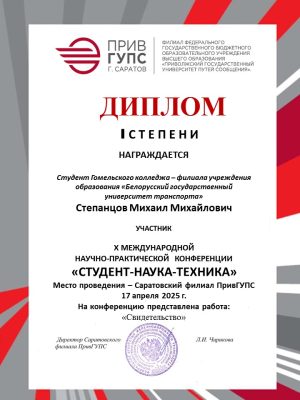 17 апреля 2025 года учащийся нашего колледжа Степанцов Михаил (руководитель Ермольчик Тамара Владимировна) дистанционно участвовал в X Международной научно-практической конференции «Студент-Наука-Техника», организованной Саратовским филиалом ПривГУПС.