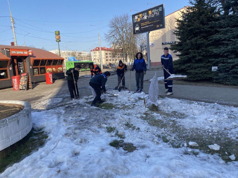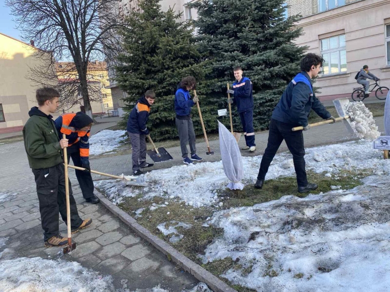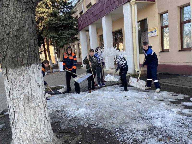 12 марта 2026 года в колледже традиционно проходит акция «Чистый четверг», учащиеся убирают снег. — Гомельский колледж-филиал УО БелГУТа