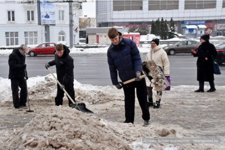 07 февраля 2026 года работники и учащиеся Гомельского колледжа-филиала БелГУТа убирали снег и лёд по улицам Советской и Хатаевича. 09/02/2026 Новости В Гомеле уборка снега объединила Центральный район